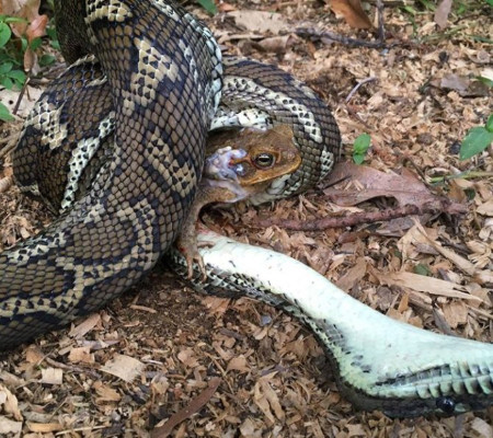 Na costa leste da Austrália, em Kingscliff, no norte de New South Wales, um morador presenciou e divulgou o ocorrido inusitado de seu quintal: uma serpente píton-carpete havia sido morta pela sua presa, um sapo de cana.