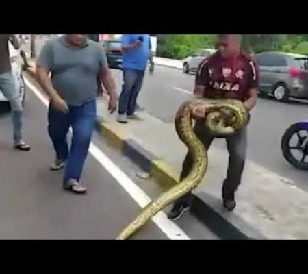 Um outro vídeo mostra o momento em que dois homens capturam o animal. Um deles segura a cabeça e pega a sucuri no 'colo', enquanto outro ajuda a carregar pelo rabo. Ela foi retirada da via e colocada em uma área verde que fica nas proximidades de um pequeno rio.