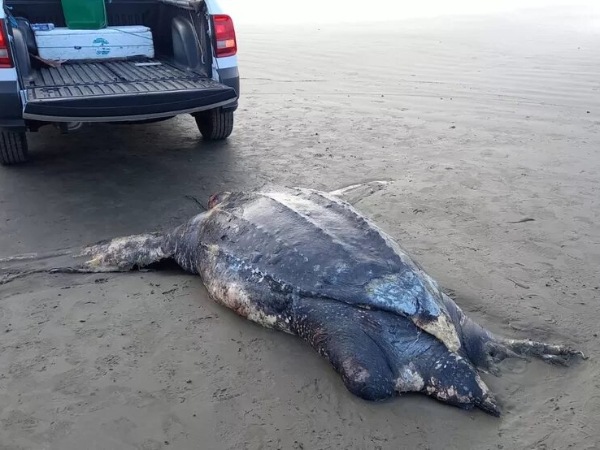 Uma tartaruga-de-couro (Dermochelys coriacea), de 2,11 metros, foi encontrada morta por um banhista em uma praia no bairro Oásis, em Peruíbe, no litoral de São Paulo. O Instituto Biopesca foi acionado e precisou fazer a necropsia ainda na faixa de areia por conta do tamanho do animal. O procedimento, de acordo com o órgão, normalmente é realizada na sede da instituição.
