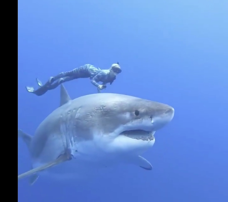 Esse grande tubarão-branco, de 6 metros de comprimento foi encontrado próximo da ilha de Oahu, Havaí. Eles acreditam que este seja o maior já registrado e, é majestoso. A proximidade era tanta que é possível observar cada detalhes do corpo do predador, como seus olhos, dentes e brânquias. Em outro momento, a mergulhadora chega a segurar a barbatana do tubarão, que não demonstra qualquer agressividade e continua nadando, de maneira impressionante e amigável.
