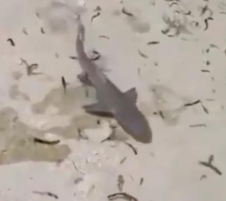 O pequeno tubarão escapou por muito pouco, enquanto explorava uma região de águas rasas. Quem já tinha medo de tubarão agora pode também temer os peixes barracudas. O animal é carnívoro e, dependendo da fome e do sentimento de ameaça, também pode morder um ser humano.