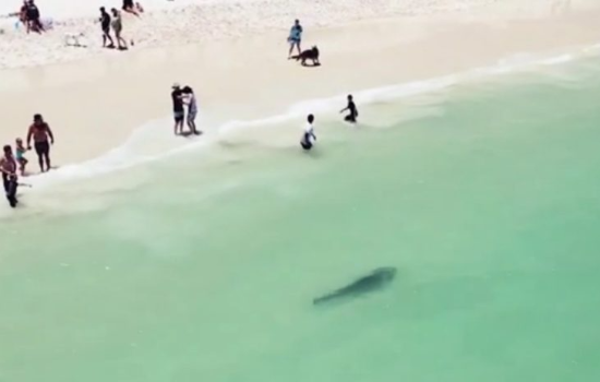 Banhistas correm de grande tubarão que chegou bem perto da areia