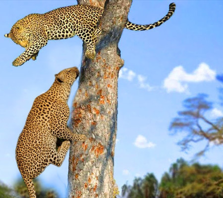Uma das leoas decidiu tentar sua sorte, escalando a árvore para roubar a presa do outro felino. Enquanto lutavam, o ramo que os suportava acabou se quebrando e ambos caíram no chão. Contudo, o leopardo logo se apressou em fugir da "gangue" leonina, deixando para trás nada mais do que restos. Assista: