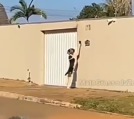 No vídeo, o cachorro se estica para apertar o botão da campainha e chama os donos para abrirem o portão. O pet olha para ela e em seguida aperta novamente o botão. As imagens curiosas foram compartilhadas nas redes sociais e blogs de humor.