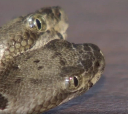 Um vídeo que mostra uma jovem cascavel de madeira encontrada em Nova Jersey com duas cabeças totalmente formadas, quatro olhos e duas línguas oscilantes, se tornou novamente viral nas redes sociais.
