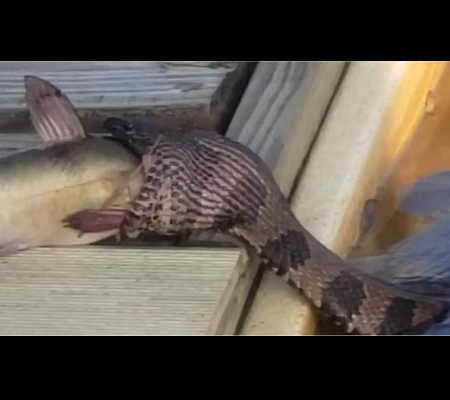 Homem filma uma cobra tentando engolir um peixe inteiro em uma doca em Washington, Carolina do Norte. Aparentemente a cobra estava na água e o peixe tinha acabado de ser pescado. A cobra em um ataque surpresa dá um bote no peixe direto da água. No vídeo a cobra tenta engolir o peixe, mas parece que ele é muito grande.