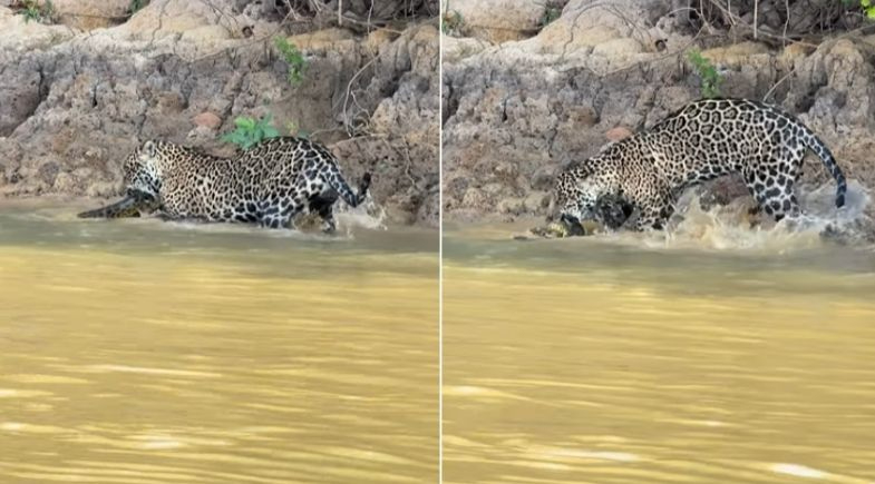 Nas imagens, o felino aparece se aproximando lentamente da cobra antes de atacá-la. Em poucos segundos, a onça consegue dominar o réptil, surpreendendo os turistas que acompanhavam o passeio.