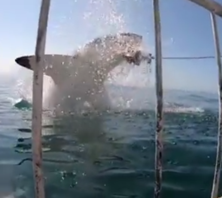 A cena incrível, que ocorreu na África do Sul, foi registrada pelo fotógrafo amador de tubarões Paul Barto, segundo o tabloide Daily Star. Paul estava parcialmente submerso em uma jaula de mergulho, quando o predador gigante resolveu dar um salto assustador em sua frente.