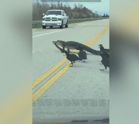 Vídeo flagra jacaré arrastando sua presa morta do outro lado da rua com um bando de abutres famintos seguindo-o na Flórida. O vídeo foi gravado por um motorista que parou abruptamente pegou seu celular e começou a capturar a cena hilária. O jacaré aparentemente não se importa com os abutres querendo pegar sua presa.