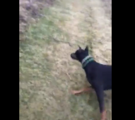 Um vídeo postado na rede social TikTok mostra um cachorro da raça doberman correndo em direção ao seu dono e, ao se deparar com uma cobra, lança-a para longe.