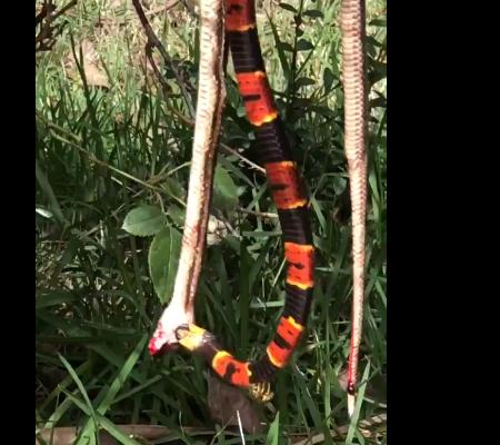 O vídeo mostra uma cobra-coral balançando no ramo em uma tentativa de comer uma serpente morta.