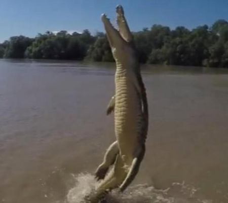 Vídeo mostra os famosos crocodilos saltadores do rio Adelaide em um salto imenso para capturar sua presa. O imenso poder do salto desses crocodilos está na sua cauda para se impulsionar completamente para fora da água para capturar a isca.