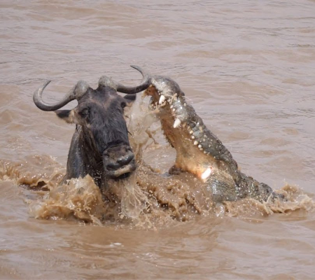 Quando encontrou o momento certo, o réptil surge com a grande mandíbula aberta para atacar um gnu, que contou com a sorte para escapar do ataque cruel do feroz predador, continuando sua travessia em segurança.
