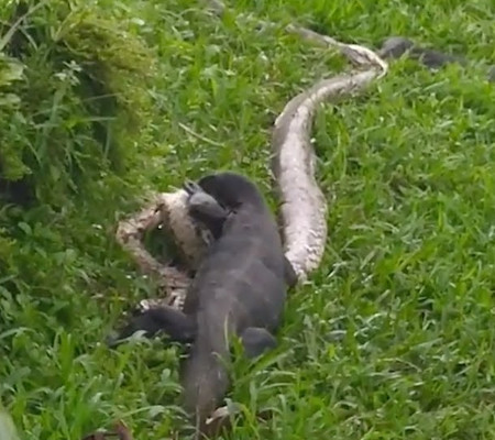 Após engolir quase completamente sua presa, o animal parece ter tido um "banquete indigesto" e, começou a regurgitá-la. De acordo com as testemunhas, o lagarto gastou muito tempo tentando engolir a píton, e por ter o "olho maior que a barriga", certamente teve uma grande indigestão. Cenas fortes a seguir: