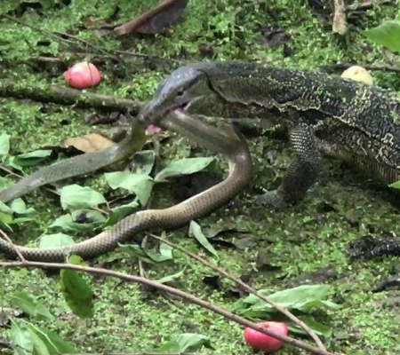 Um vídeo em que mostra um lagarto atacando uma cobra no quintal de uma residência se tornou novamente viral, após ser compartilhado no twitter. Nas imagens mostra o momento em que os dois réptil se encaram e o lagarto faminto parte para cima e aplica uma mordida certeira no corpo da cobra e em seguida a arrasta para um lago. A cobra sem defesa virou almoço neste dia.