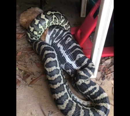 O especialista australiano Luke foi convocado para remover com segurança uma píton que se encontrava em Eerwah Vale, no leste da Austrália. Ao chegar no local, Luke se deparou com uma lamentável cena: a cobra devorava um gato de estimação.