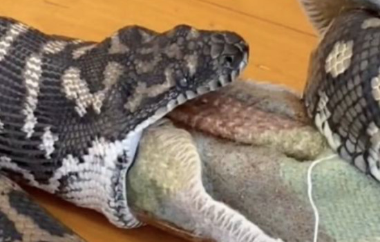 Uma píton invadiu uma casa na Austrália para comer um cachorrinho, o animal de estimação de uma família. No entanto, o réptil se confundiu com o cheiro do pet e acabou engolindo um cobertor.