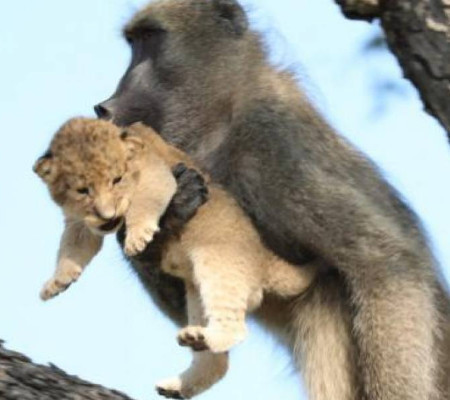 Um acontecimento inusitado foi flagrado no Parque Nacional Kruger, na África do Sul. O protagonista é um macaco babuíno que carregava um filhote de leão nos braços, lembrando muito uma cena do icônico filme da Disney, “O Rei Leão”.