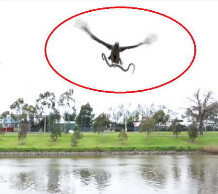 Pelas imagens, a ave sobrevoava um lago e era admirada por algumas pessoas, quando de repente, ela captura a cobra na margem e dispara o animal com força a quem o assistia. Veja: