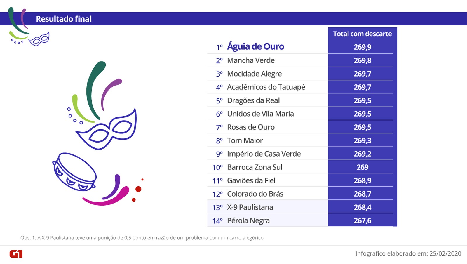 A Águia de Ouro é a grande campeã do carnaval 2020 de São Paulo. Este é o primeiro título da escola no Grupo Especial do carnaval paulista. Pérola Negra e X-9 Paulistana foram rebaixadas. A apuração das notas, que aconteceu na tarde desta terça-feira (25), diretamente do Anhembi. As informações são do G1.