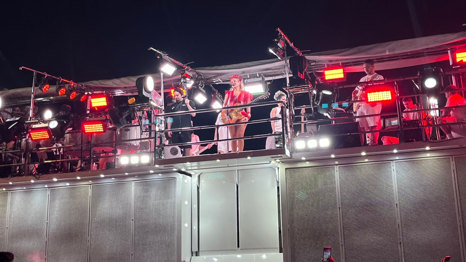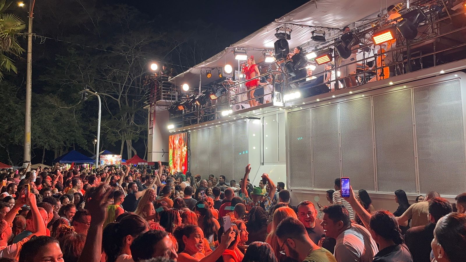 Ai, meu Deus, estou me sentindo tão feliz de estar aqui. Hoje eu vim radiante para extravasar em cima do trio. Tô com um monte de música nova, tô com gosto de carnaval na boca. Tô muito feliz, quero me divertir com vocês.