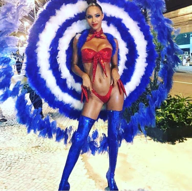 Para algumas das fantasias, ele apostou nas duas cores, como no costão de Laís Ribeiro e no vestido longo e justo de Camila Coutinho. Carol Trentini veste um body nude com plumas e modelagem nos seios que lembra o sutiã cônico, desenhado por Gaultier para Madonna nos anos 1990.