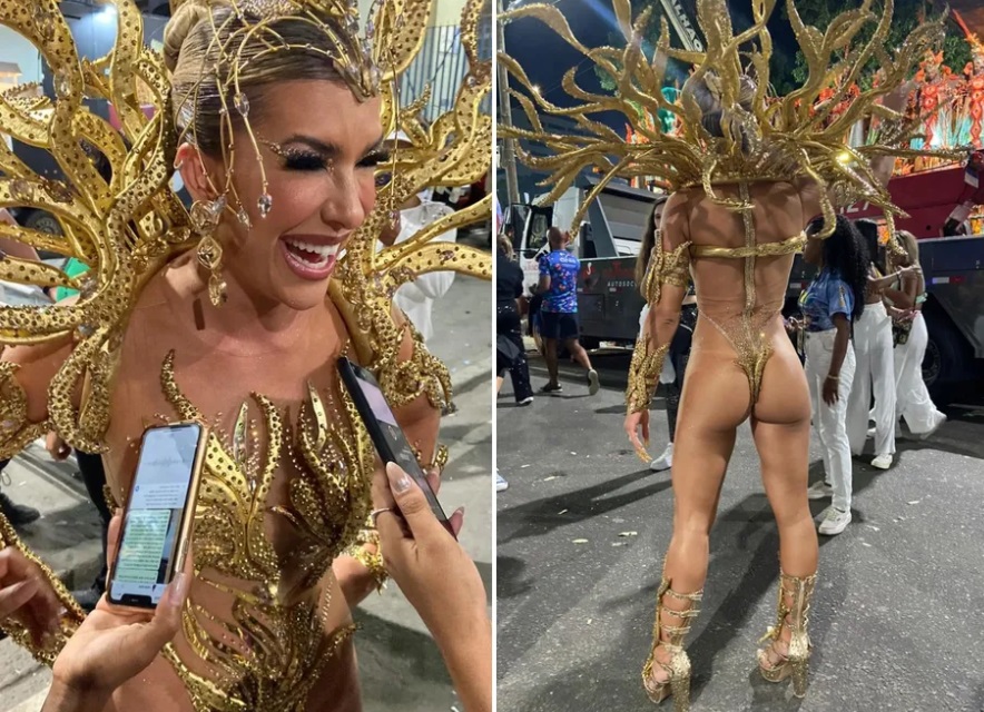 Lore Improta desfilou como musa da Viradouro na manhã desta terça-feira (21) no Rio. A dançarina, que é casada com Léo Santana, contou na concentração que não estava usando tapa-sexo.