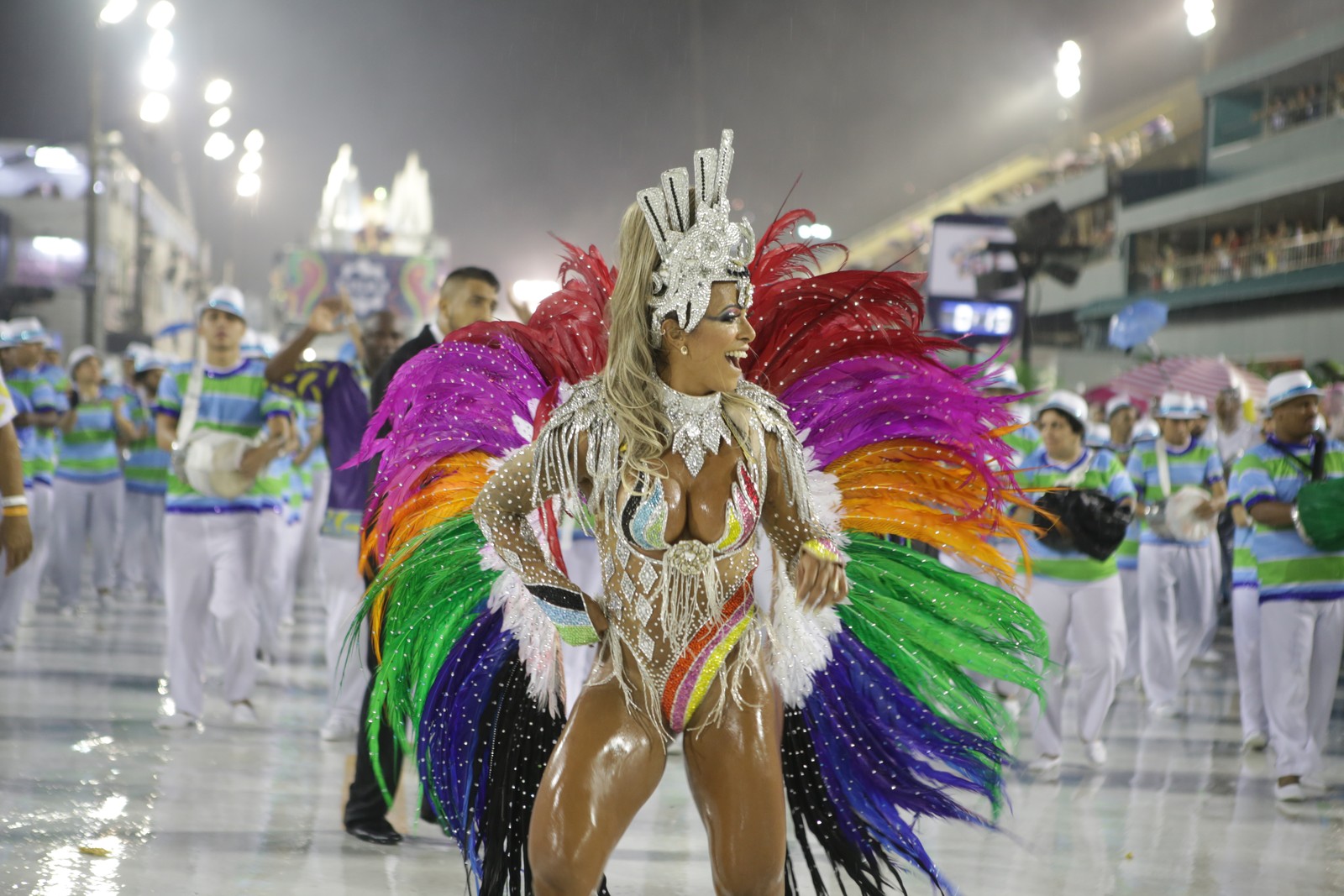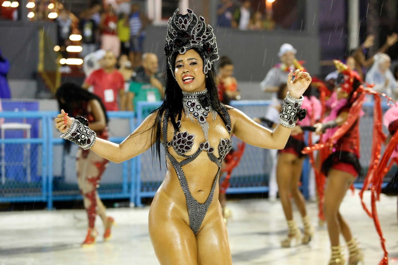 “Ih, choveu... meu body encolheu”, brincou Michelly Boechat, musa da Unidos da Ponte, sobre o figurino mínimo com que cruzou a Marquês de Sapucaí.
