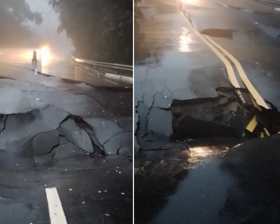 Rodovia fica interditada após asfalto ceder devido a fortes chuvas que atingem a Baixada Santista. (Foto: Aconteceu em Bertioga)