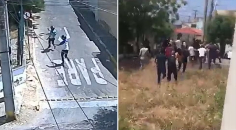 As imagens mostram alunos correndo em desespero e um jovem caindo imediatamente ao ser atingido. Após os disparos, os atiradores fugiram de moto.
