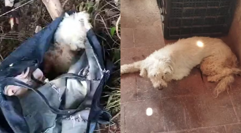 O animal foi localizado após policiais do Batalhão de Polícia de Meio Ambiente (BPMA) receberem uma denúncia sobre um veículo que teria abandonado a cadela em uma sacola de tecido com zíper fechado.