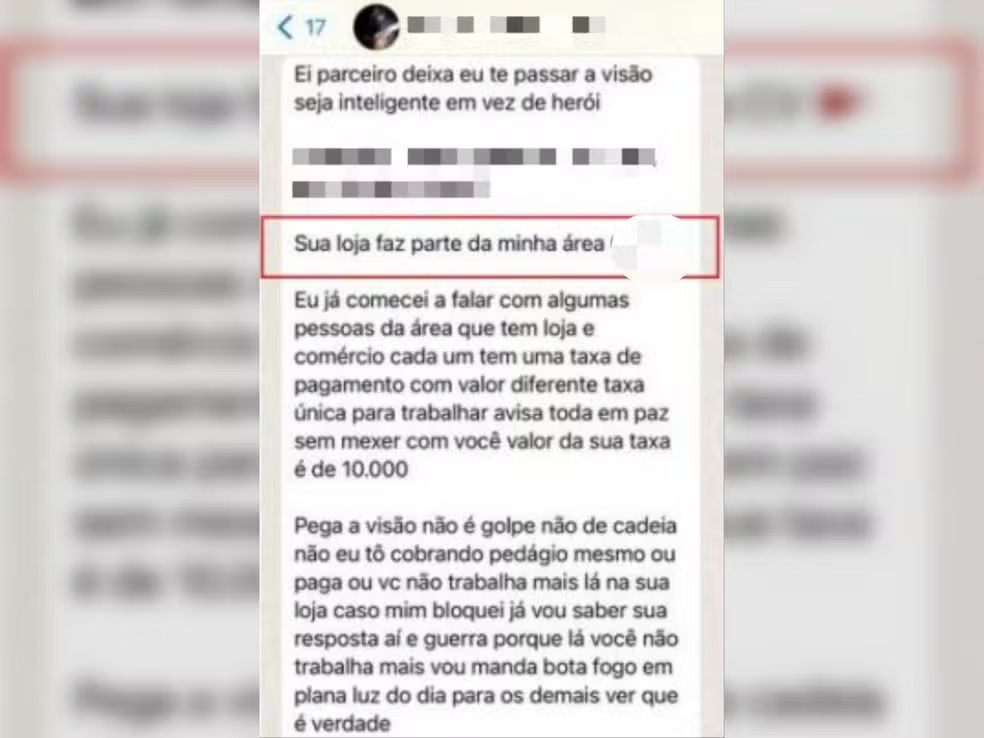 Para você trabalhar em paz na minha área você tem que pagar uma taxa única de 10.000. Caso não pague, você não trabalha mais no Centro, porque eu não vou deixar, diz um trecho da mensagem recebida pelo empresário.