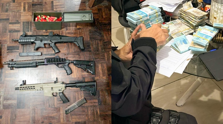Durante o cumprimento dos mandados, foram apreendidas quatro pistolas, um revólver, duas carabinas, uma arma calibre 12, além de diversas munições, valores em espécie, cheques, veículos, documentos, telefones e computadores.