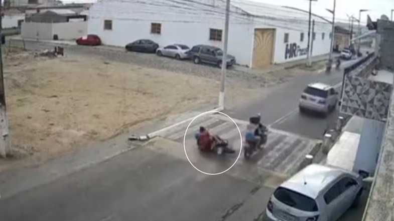 Uma câmera de segurança registrou o momento em que o homem perdeu o controle da moto, derrapou e caiu na pista com os dois passageiros, na Rua Basílio Vieira Carneiro, no Bairro Tibiquari.