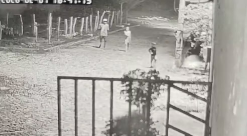 Um homem foi flagrado por câmeras de monitoramento incentivando uma criança a esfaquear outras no bairro Alto Guaramiranga, em Canindé (CE). Eles seriam pai e filho, segundo informações de populares.