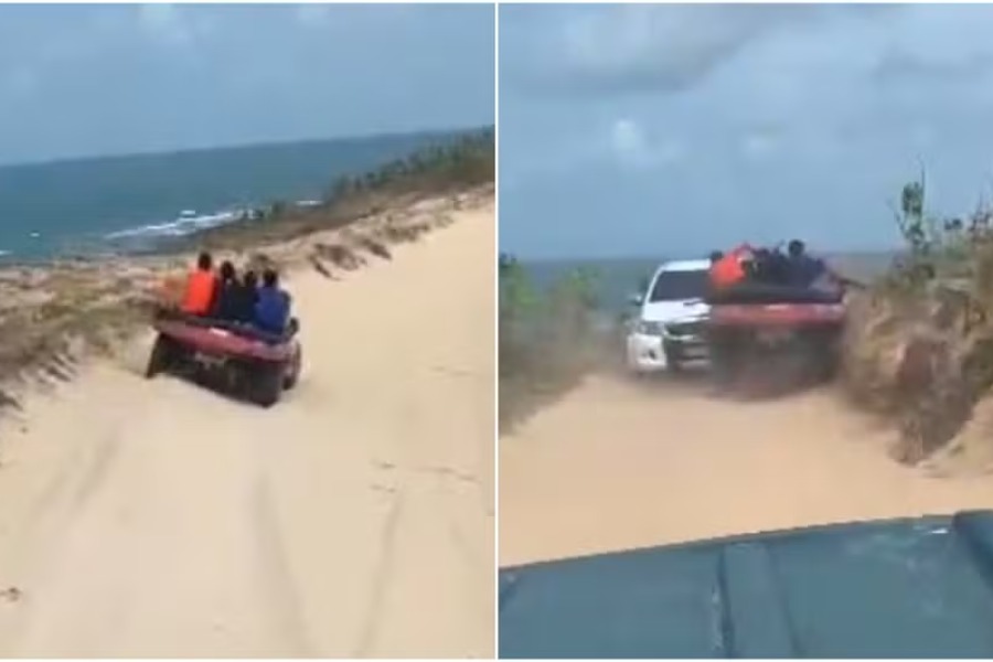 Um buggy que transportava turistas colidiu com uma caminhonete durante um passeio nas dunas da Praia de Canoa Quebrada, em Aracati, no litoral do Ceará, no último domingo (12). O acidente foi registrado por um dos ocupantes de outro buggy. Veja o vídeo abaixo: