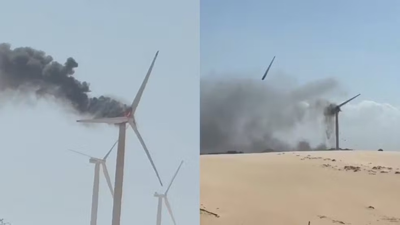 Uma turbina do Parque Eólico Cumbe pegou fogo nesta sexta-feira (22) em Aracati, no litoral do Ceará, a cerca de 155 km de Fortaleza. Testemunhas filmaram ( o equipamento pegando fogo enquanto funcionava até que as pás eólicas se soltam.
