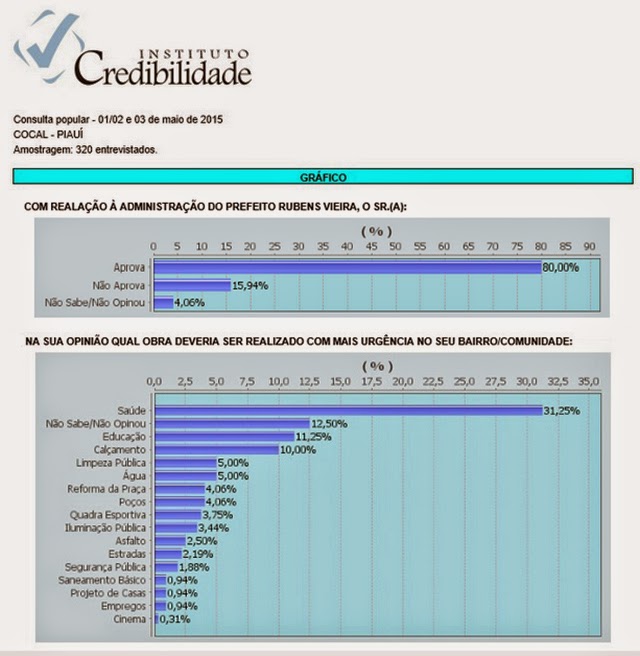 Uma pesquisa feita pelo Instituto de Opinião Pública Credibilidade aponta que quatro em cada cinco moradores (80%) do município de Cocal se declaram satisfeitos com a gestão do Prefeito Rubens Vieira (PSDB). Segundo o levantamento, apenas 15,94% não aprovam e 4,06% não sabem/ não opinam. A margem de erro da amostra é de 5,44% (para mais ou para menos) e o grau de confiança é de 95%.