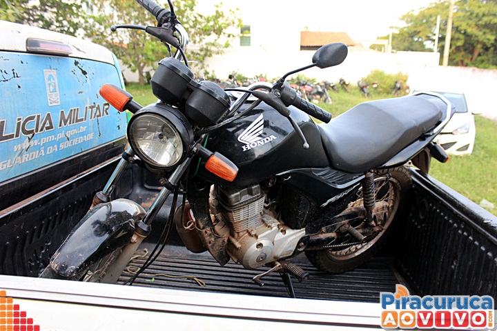Uma moto modelo CG Fan, de cor preta, com placa de Timon/MA, registro que estava bastante danificado, estava na garagem da residência onde os elementos foram capturados, o veículo foi recolhido para o pátio da delegacia.