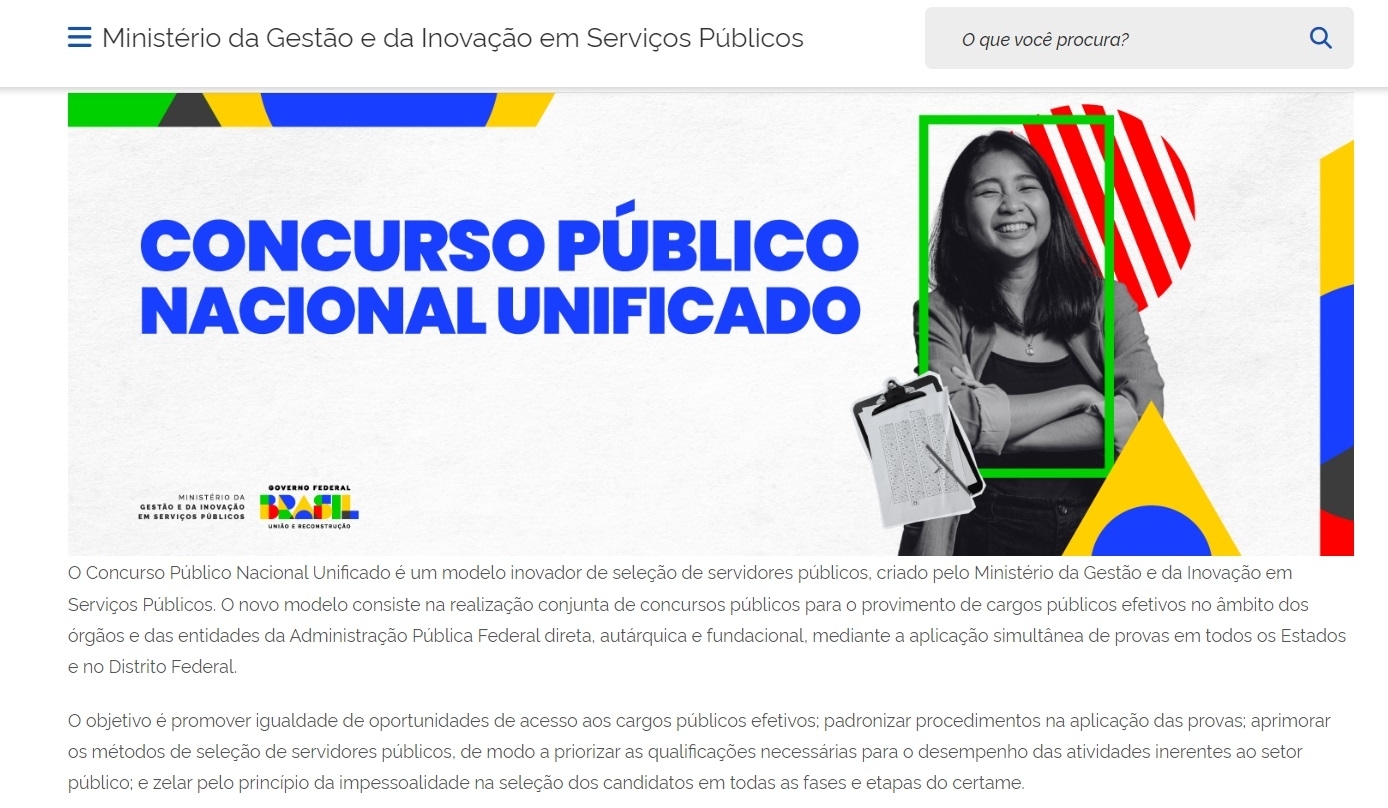Realizado pelo Ministério da Gestão e da Inovação em Serviços Públicos, as provas do Concurso Público Nacional Unificado (CPNU) ocorrerão no próximo domingo (5), em todo o país. Serão 3.665 locais para aplicação, sendo escolas e universidades, totalizando 75.730 salas. Ao todo são mais de 2,1 milhões de candidatos disputando uma das 6.640 vagas. O governo federal considera a maior prova desse tipo na história do país, de acordo com o ministério.