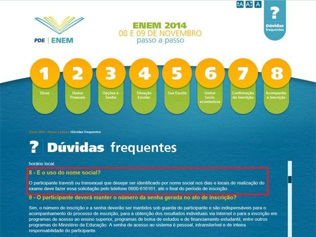 Segundo o site, "o participante travesti ou transexual que desejar ser identificado por nome social nos dias e locais de realização do exame deve fazer essa solicitação pelo telefone 0800 616161, até o final do período de inscrição". O edital do Enem 2014, no entanto, não faz nenhuma referência ao uso do nome social pelos candidatos.