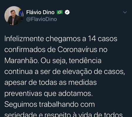 Subiu para 14 o número de casos registrados do novo coronavírus (COVID-19) no estado do Maranhão. A informação foi confirmada na noite dessa quinta-feira (26) pelo governador do Maranhão, Flávio Dino, por meio de uma rede social.As informações são do G1.