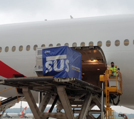 Após os trâmites alfandegários, a carga segue em aeronave da empresa Azul ao aeroporto do Galeão, no Rio de Janeiro.
