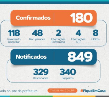 No dia 19 de abril, Timon confirmou os 04 primeiros casos da doença no município. Em pouco mais de um mês, esse número subiu para 180 casos confirmados. O crescimento mostra que a curva da doença vem subindo.