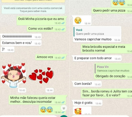A repercussão também surpreendeu a Juliana Cândido Benedicto que foi quem conversou com Adriano pelo WhatsApp da pizzaria da família. Em fevereiro deste ano, o comércio completou dois anos de funcionamento.