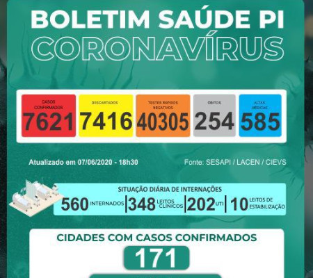 O Piauí possui 7621 casos confirmados e 254 mortes por Covid-19.