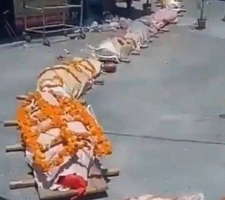 Uma imagem chocante publicada pelo jornal britânico "Sun" mostra vários corpos em fila no chão em um calor de 40° C no crematório Shubash Nagar, localizado na capital. Lá, os corpos de vítimas estão sendo cremados coletivamente.