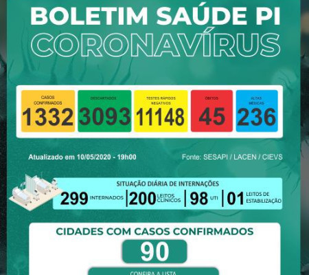 O outro óbito é de Valença. O paciente tinha 82 anos e estava internado no Hospital Natan Portela, em Teresina. Tinha histórico de cardiopata. De acordo com o boletim de hoje, foram confirmados mais 54 casos de Covid-19. São 32 mulheres e 22 homens, com idades que variam de 5 anos a 92 anos.