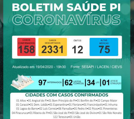 Com isso, 24 municípios do Piauí passam a ter casos confirmados de Covid-19. Dos casos positivos, são 9 mulheres e 5 homens, com idades que variam de quatro meses a 57 anos. O bebê é de Teresina.