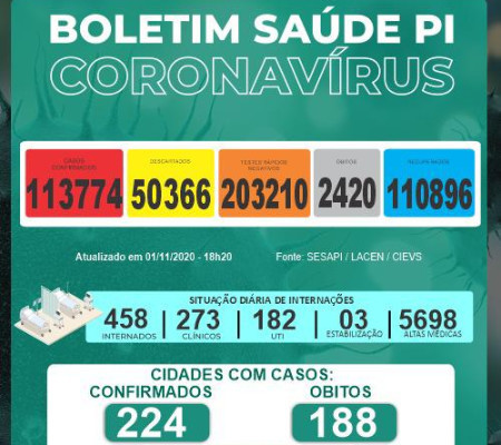 Os casos confirmados no estado somam 113.774 distribuídos em todos os municípios piauienses. Já os óbitos pelo novo coronavírus chegam a 2.420 e foram registrados em 188 municípios. Até agora, morreram 1.406 homens e 1.014 mulheres.